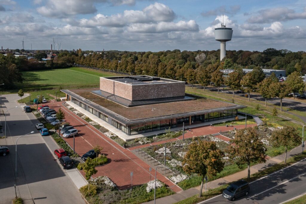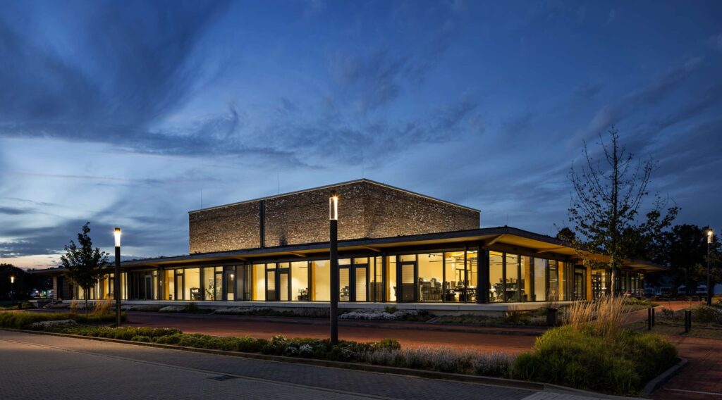 Gebaut wur­de nach den Prin­zi­pi­en der zir­ku­lä­ren Wert­schöp­fung: Der Klin­ker stammt aus einem Fabrik­ab­bruch aus der Regi­on, für den Außen­teil wur­de größ­ten­teils Holz als nach­wach­sen­der Roh­stoff ver­wen­det und die Innen­wän­de wur­den als Lehm-Tro­cken­bau mit einer her­vor­ra­gen­den Kli­ma­bi­lanz errich­tet und mit Lehm­putz ver­putzt.